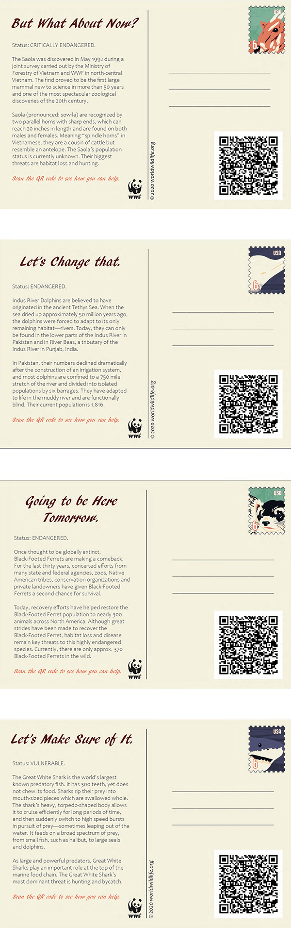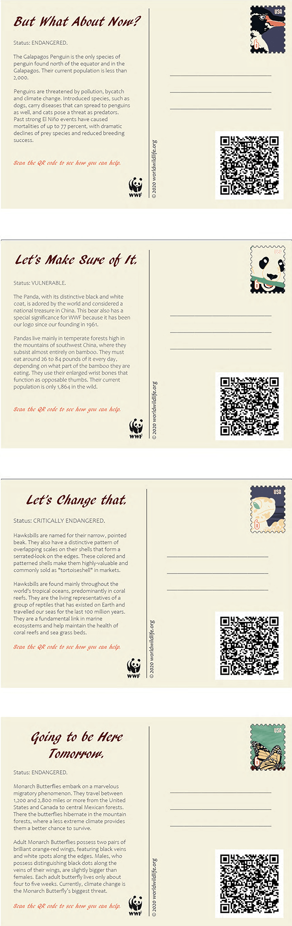 I was heavily inspired by vintage art deco postcard and travel poster designs. I used phrases such as “wish you were here, but what about now?” and “here today, going to be here tomorrow” to serve as calls to action. On the backs of the postcards are information about the animal, whether it’s endangered/vulnerable, as well as a scannable QR code that takes the recipient to the WWF’s Call to Action page where they could donate or find more information on how to help the endangered species featured.